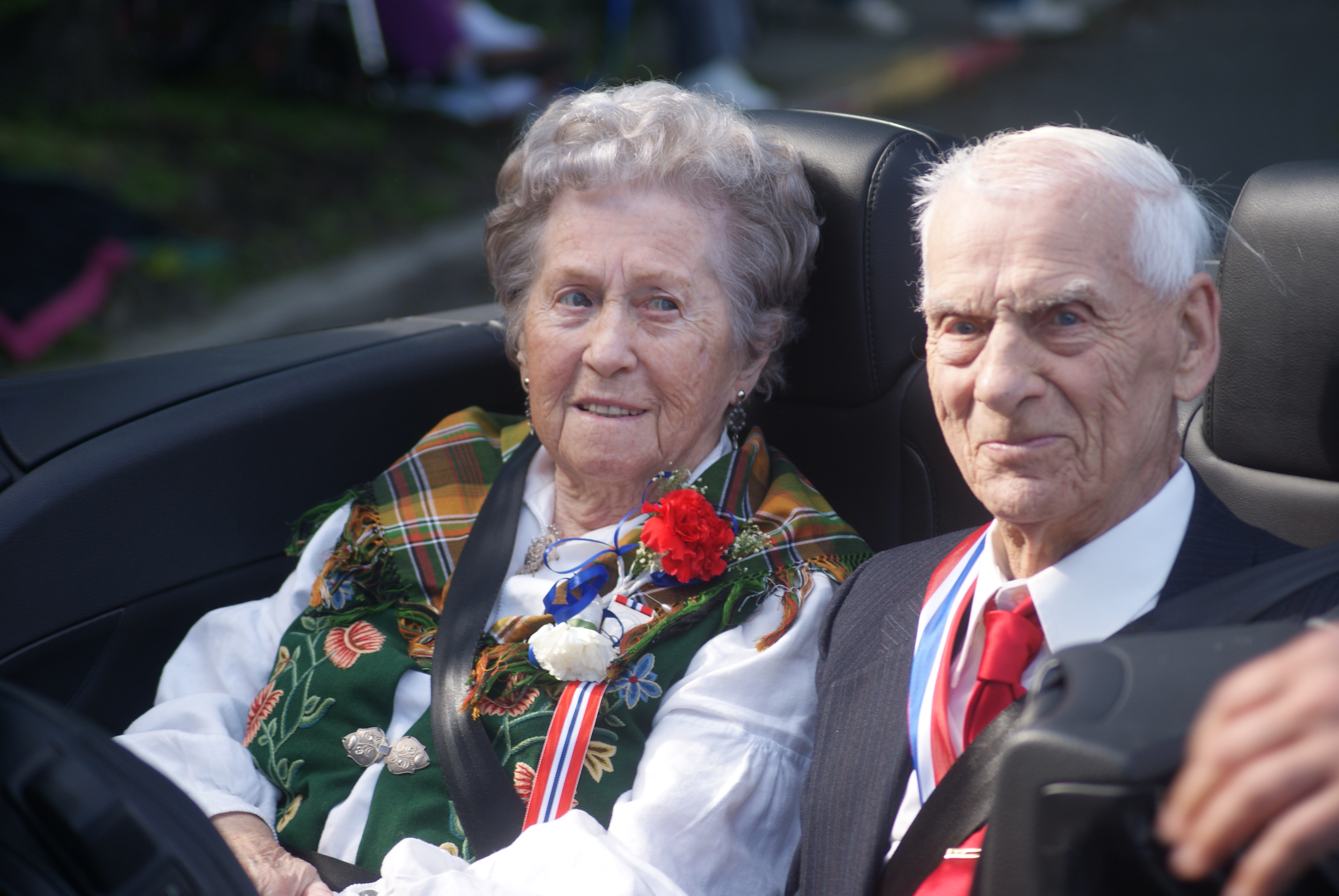 Photo 11:  May 17, 2011:   Knut and Haldis Einarsen in a chauffeur-driven convertible just minutes before the annual Norwegian Independence Day Parade began in Ballard (Seattle), Washington.  (Photo belongs to C.E. Chambers/Diana Einarsen)