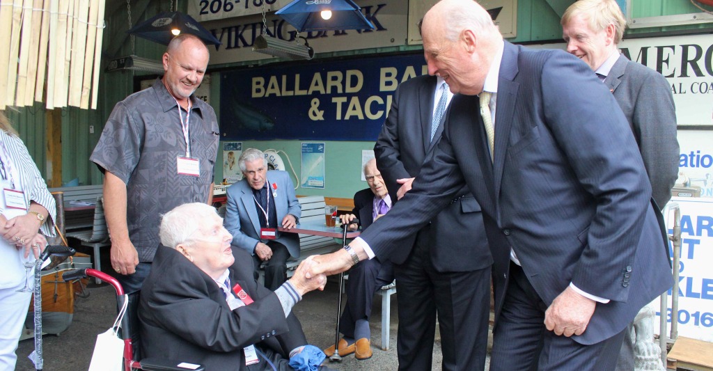 UPDATE May 22, 2015 (Friday):  Knut was introduced to King Harald V by Seattle’s Norwegian Consul, Kim Nesselquist, during a barbecue luncheon at the Pacific Fishermen’s Shipyard in Seattle.  Knut had met the King for the first time in 1995 at the Leif Erikson Lodge in Seattle, and years before that had been introduced to his father, King Olav V, while on vacation in Norway.  (A Norwegian-language article about the King’s appearance at the Shipyard can be read at Karmøy Nytt, http://karmoynytt.no/2015/05/23/hjertelig-gjensyn-med-kong-harald/)