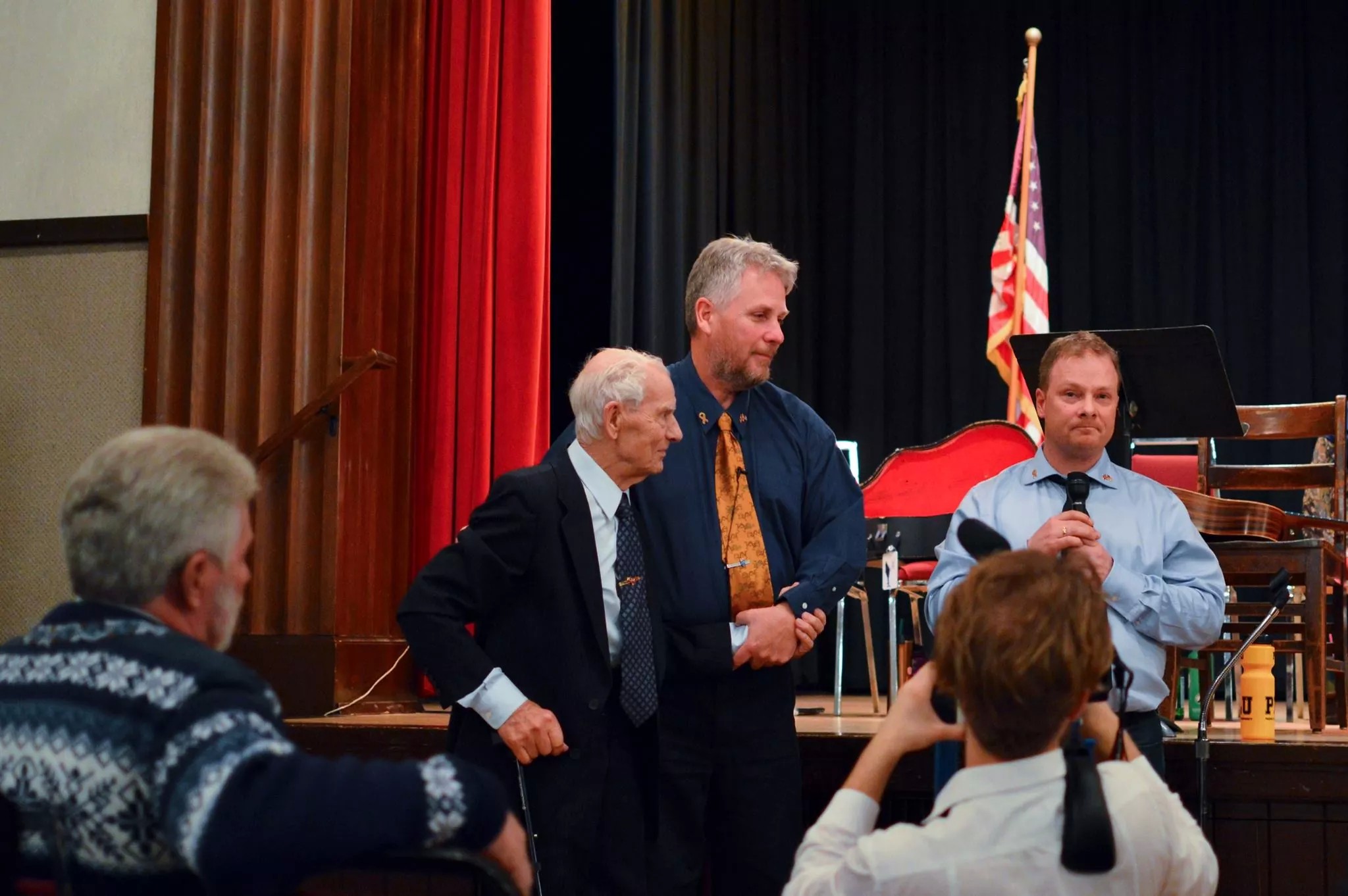Knut talking to the Mayor of Kenmore 10-27-14Photo 22:  October 27, 2014:  Mayor David Baker of Kenmore, WA issued a formal proclamation congratulating Knut on his 100th birthday in which he shared some of his history and achievements.