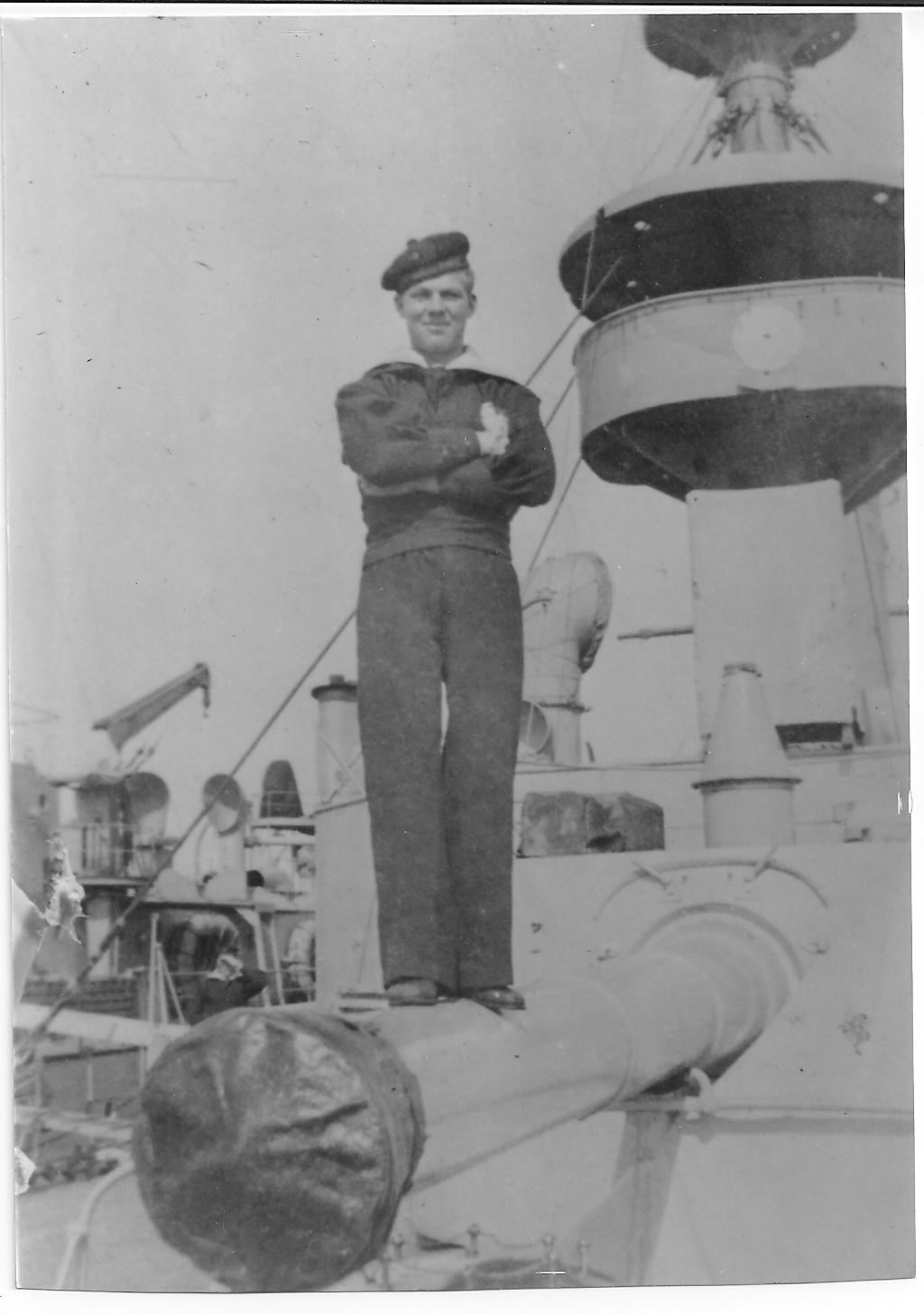 Photo 1:  Knut Andreas Einarsen proudly standing on the Norwegian battleship Norge in 1935.  The ship was sunk by the Germans during their invasion of Norway in April 1940.  (Photo belongs to Knut and Haldis Einarsen.  See more photos below.)