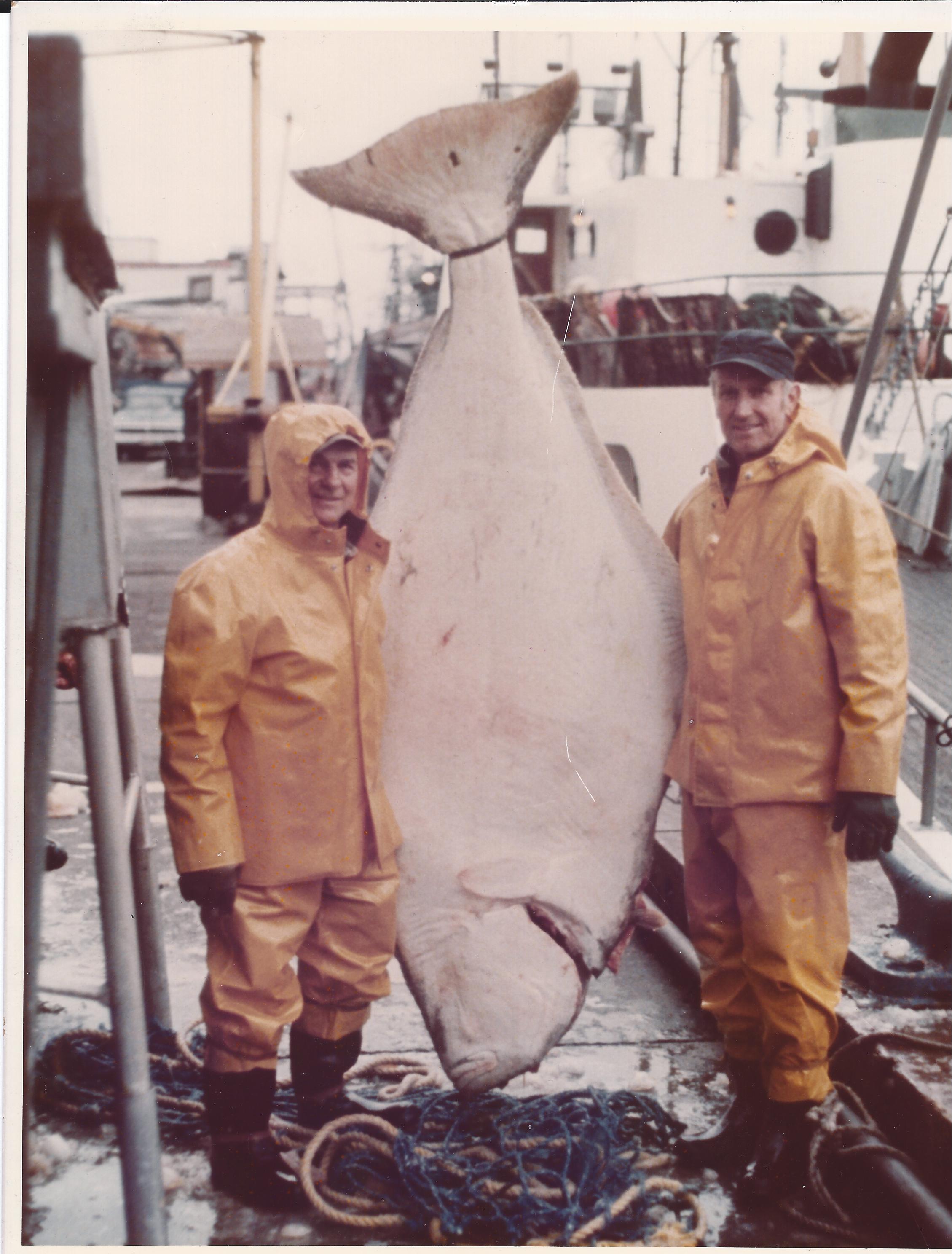 Photo 2:  1970s:  Knut with a 435 lb. halibut he had helped catch.  The other fisherman is 6’3″.  (Photo belongs to Knut and Haldis Einarsen)
